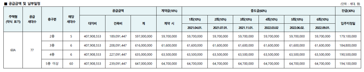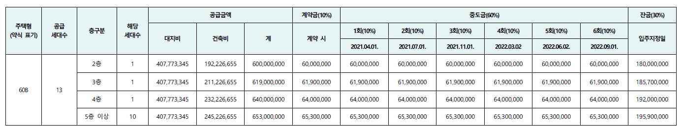 60B타입은 분양가가 6억~6억5300만원 입니다. A타입보다 공급가가 조금 더 높습니다. 따라서 5층 이상 60B타입에 당첨된다면 계약시 6530만원이 준비되어야 합니다.