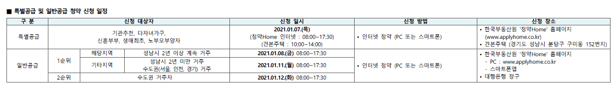-신청자격에 따라 일정이 다릅니다. 예를들어 성남시 2년 미만 거주한 분들은 내일(1/11) 청약에 신청하시면 되겠습니다.