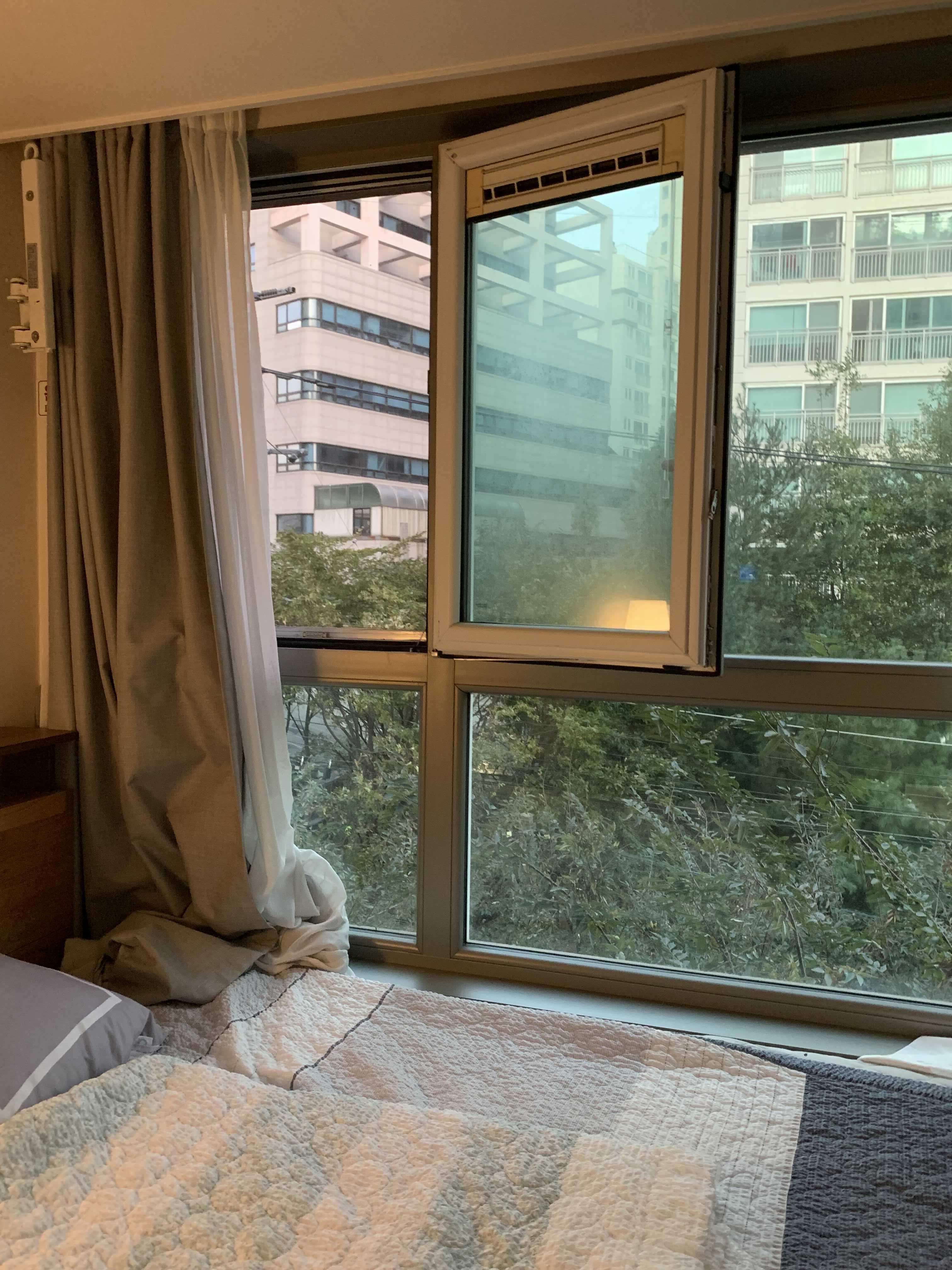 뷰는 이렇습니다. 저층이라서 가끔찍 담배냄새가 올라오는 게 단점인데, 또 나무 바로 옆에 살고 있어서 예쁘기도 해요. 오피스텔이라 확실히 환기가 문제인데... 위에 사진에서 보이는 정도만 문을 열 수 있으니 참고하세요...